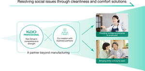 Bringing confidence and pride to workers and smiles and joy to users. By leveraging the Kao Group's comprehensive capabilities and co-creation with external partners, we implement cleanliness and comfort solutions as partners beyond manufacturing, resolving fundamental on-site challenges.