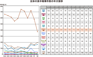 ただし、こちらの一番上の折れ線グラフは飲食店における食中毒の発生件数ですが、ここ2年ほどでグッと件数が減っています。これは、飲食店へのお客様の来店数が減っただけでなく、コロナ対策をしっかりと行っている飲食店が増えたことが原因だと思われます。