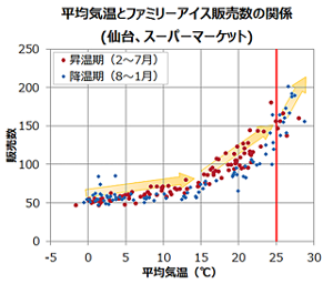 「アイスクリームの販売数が急激に伸びるのは気温が25度を超える時」というように、販売数が激増する「基準温度」をあらかじめ把握しておくことで、飲食店でもその気温以上・以下となる予測確率に応じて、販売促進策の実施などの対応を早めにとることが可能となります。