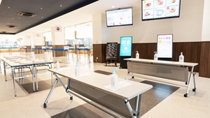 数多くの社員が勤務してる花王すみだ事業場の社員食堂では混雑回避の為に、食堂の入口から出口までを一方通行となる動線に設計し、各箇所でも対策を実施しています。
