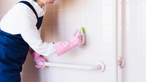 こちらの介護施設様では、週に6日入浴介助をされています。入浴介助の後は毎回浴室清掃を実施されていて、床は浴室洗剤を使用したこすり洗いを行い、壁には水をかけて汚れを流していました。