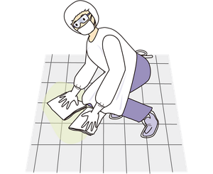 正しい身支度で自分への感染を防ぎながら、適正な消毒剤で、汚染を広げないために適切な方法でふん便・嘔吐物の処理を行いましょう。